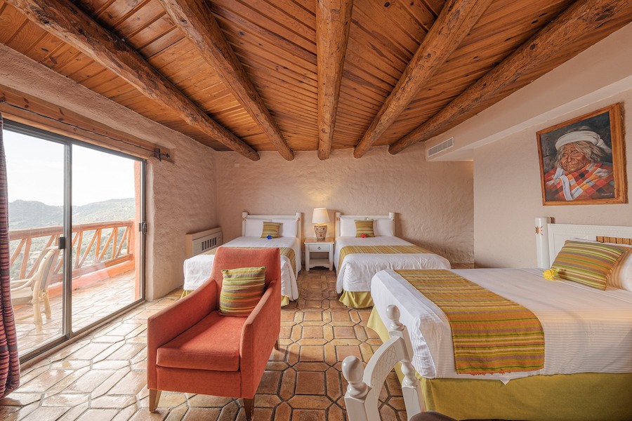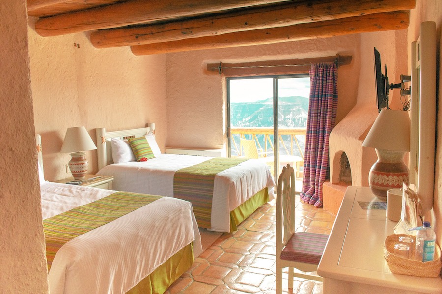Esta hermosa estructura es única en la arquitectura y la decoración y cada una de sus 70 habitaciones de lujo y suites tienen una terraza privada donde podrá disfrutar de una de las mejores vistas de la Barranca del Cobre, y vea por usted mismo por qué se ha llamado uno de los DIEZ HOTELES con la vista mas espectacular en el mundo.